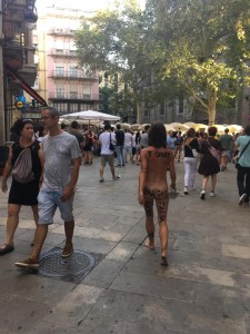 Context We performed this in Barcelona and so used a mix of Spanish and English words bodypainted onto the model. Each word represented an item of clothing; for example ‘bra’ might have been written across the chest and ‘jeans’on the legs. We then took a 20 minute walk around the pedestrianised Gothic Quarter. The performance… Read more: The Power of Words 1 – September 2018