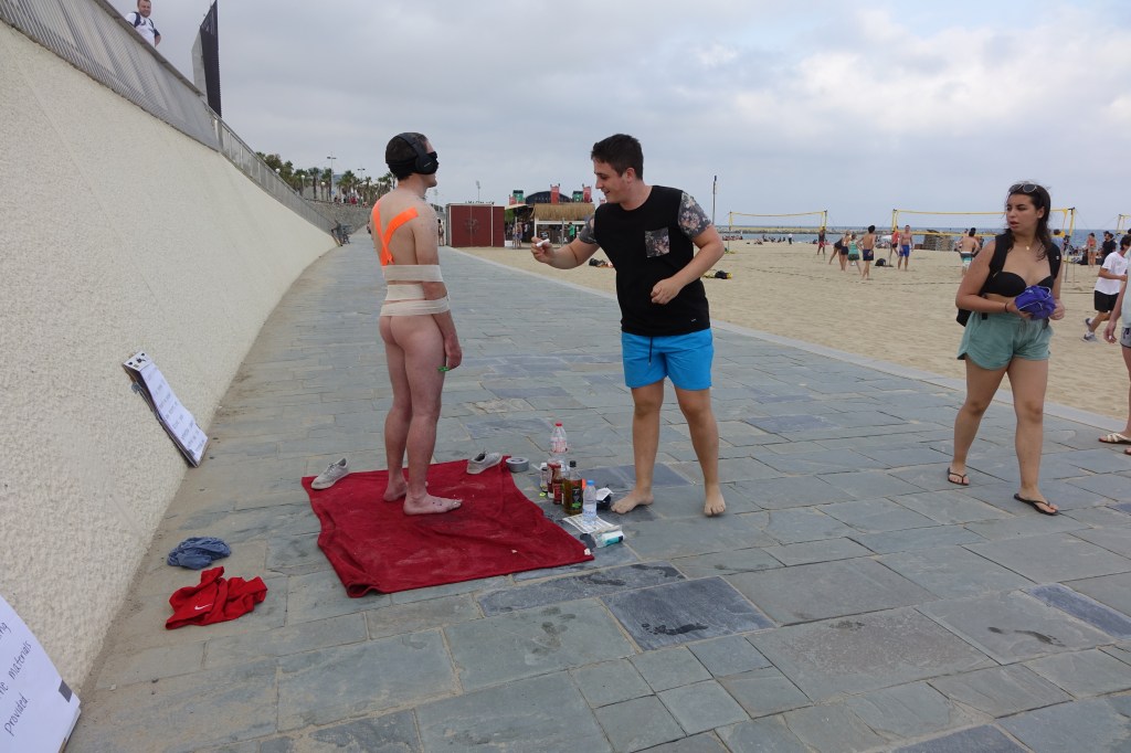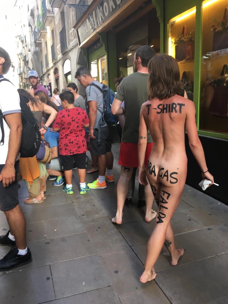 Inspired by Milo Moire’s, The Script System, the performer is nude but body painted in words representing clothes. For example ‘bra’ across the breasts and ‘trousers’ on the legs. This was first performed in Spain and so a mix of Spanish and English words were used in that instance. Similar to Brownfield the performer then undertakes a walk around the centre of the city.